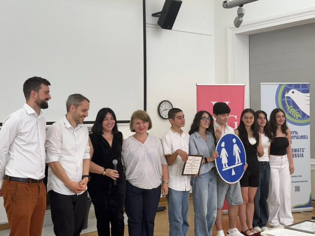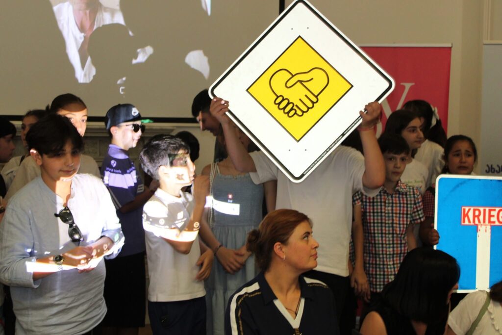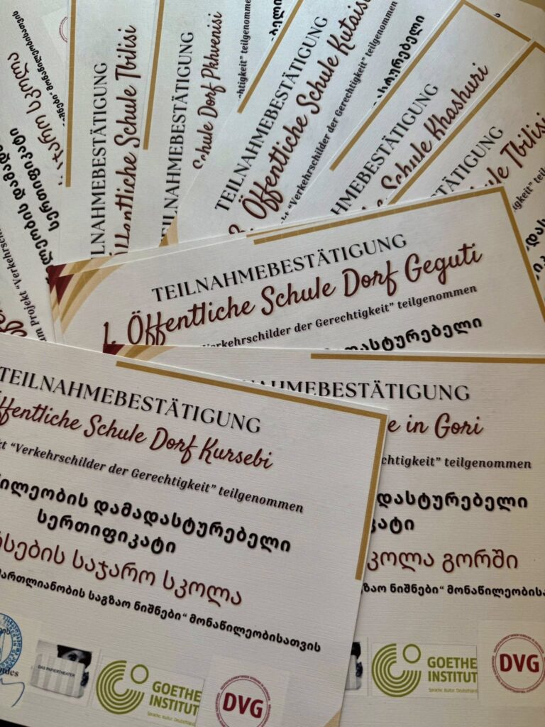Damit wurde das langjährige und erfolgreiche Projekt ” Schilder der Gerechtigkeit ” des deutschen freien Künstlers Johannes Volkmann fortgesetzt, an dem sich 22 Schulen aus Georgien beteiligten.